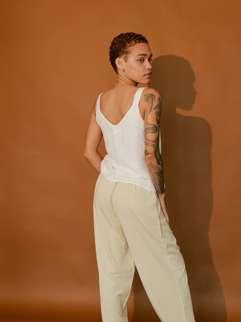 Sendo uma blusa com decote V frente e costas, sua modelagem proporciona conforto, liberdade de movimento e fácil adaptação a diferentes tipos de corpo. O design minimalista e atemporal permite inúmeras combinações, transitando com leveza entre o casual e o elegante, do cotidiano ao evento especial.