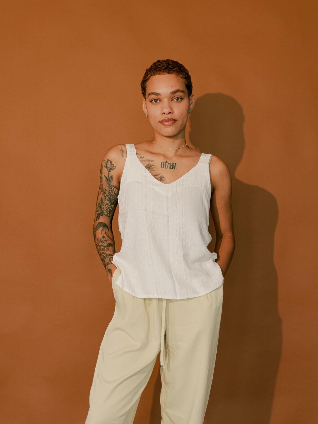 Cada peça é produzida manualmente por mulheres artesãs do cerrado goiano, que dominam todas as etapas do processo, do corte ao acabamento, com atenção e precisão. O resultado é uma blusa feita com consciência, respeito ao tempo da costura e valorização do trabalho manual.