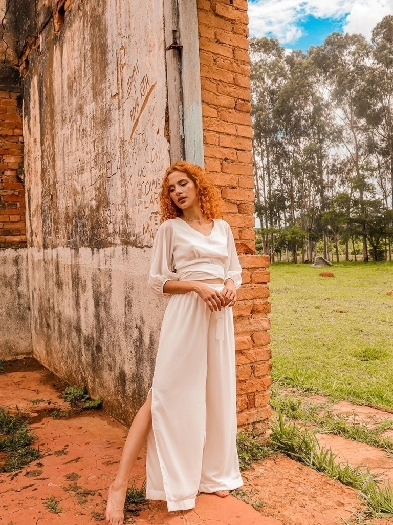 Fabricado no tecido Musseline o Conjunto Ventania combina fluidez, transparência e naturalidade, ideal para quem busca presença com conforto. Composto por uma pantalona com fendas laterais, bolsos funcionais, elástico no cós e amarração ajustável, e por um cropped com mangas bufantes e fechamento por laço frontal, esse conjunto valoriza as formas com movimento e elegância.