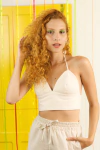 A amarração nas costas permite ajuste personalizado, garantindo conforto e versatilidade para diferentes corpos. Uma peça que une estilo e delicadeza, perfeita para composições que pedem leveza e sofisticação.