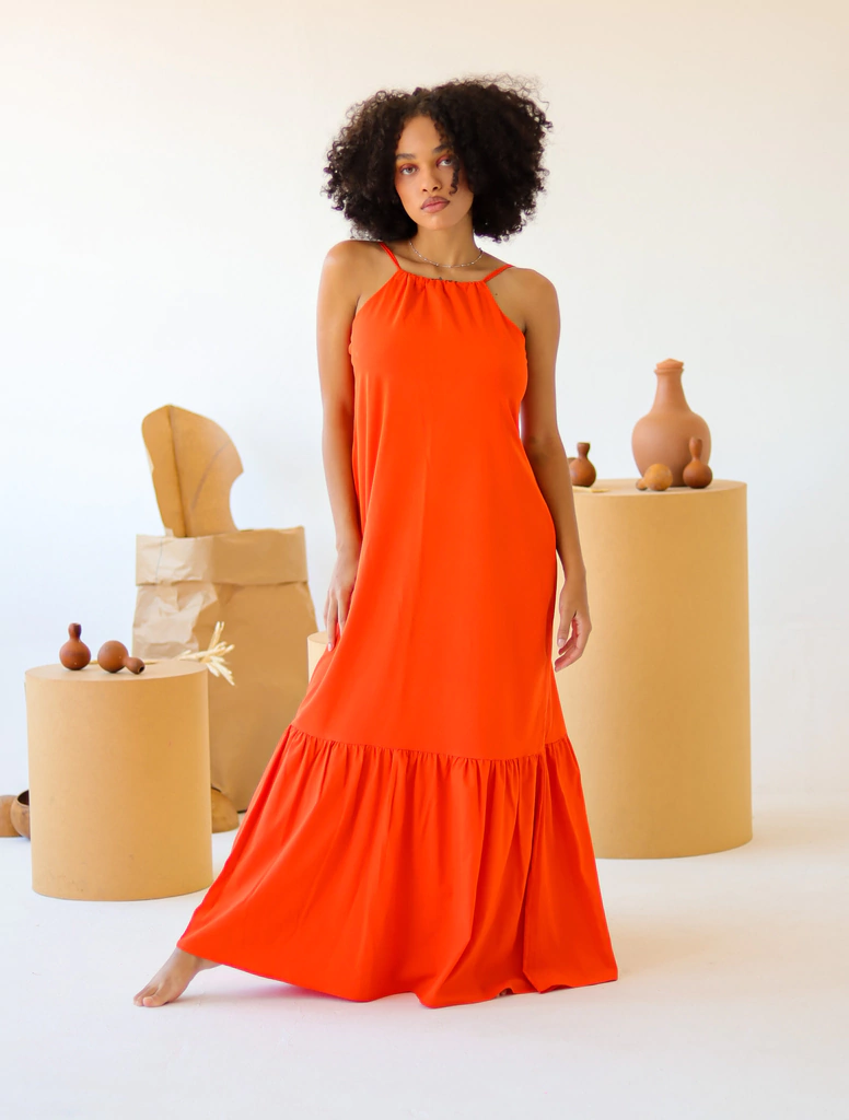 Confeccionado em viscose de toque macio e caimento leve, o Vestido Flor de Tangerina é uma peça que transmite frescor e movimento. Com babado na barra e alças ajustáveis com amarração nas costas, ele permite adaptações ao corpo, garantindo conforto e vestibilidade personalizada.