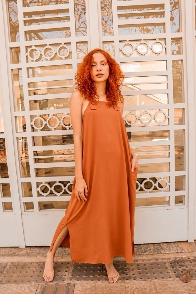 Sua modelagem reta e descomplicada veste com fluidez diferentes tipos de corpo, oferecendo liberdade de movimento e versatilidade no uso. As alças trazem um detalhe delicado no acabamento e podem ser ajustadas, o que proporciona um caimento personalizado. Conta também com dois bolsos laterais funcionais, que reforçam o caráter utilitário da peça e agregam ainda mais praticidade.