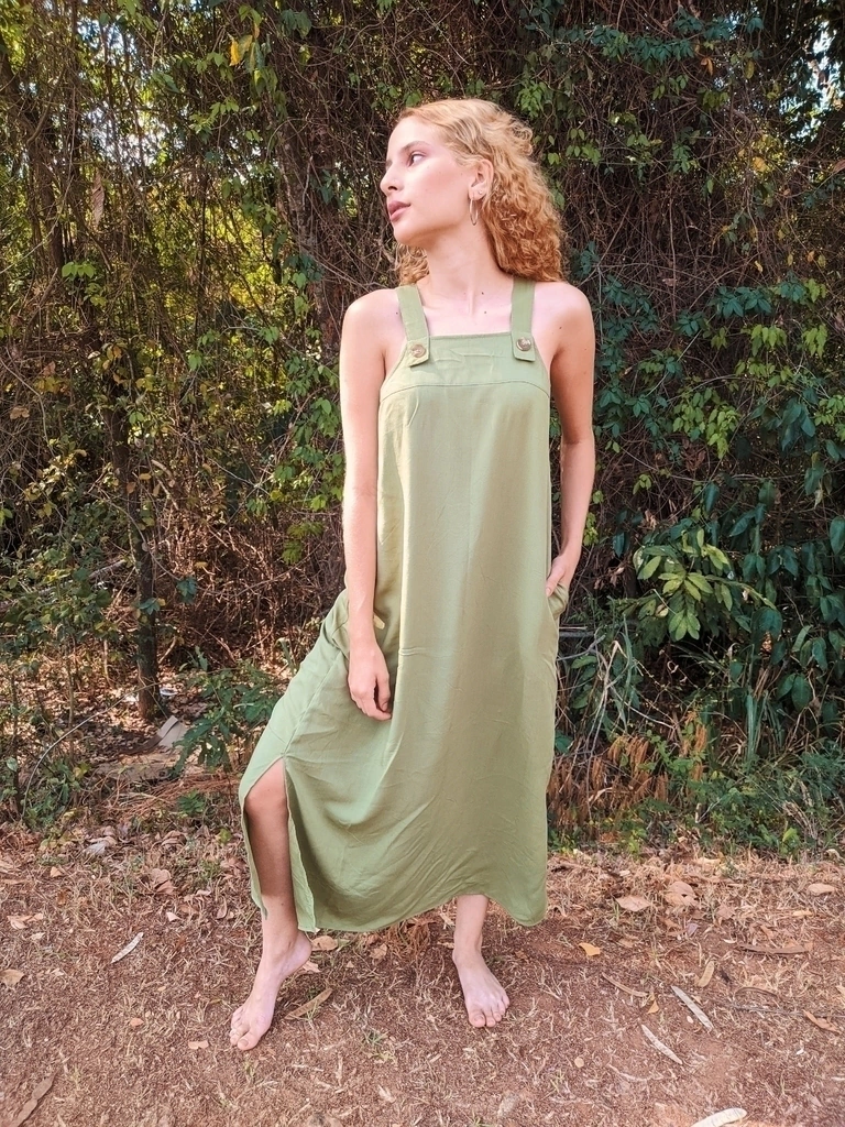 O Vestido Jardineira é confeccionado artesanalmente em viscolinho, um tecido leve e respirável que combina o caimento suave da viscose com a textura natural do linho. A escolha desse material garante conforto térmico, toque agradável na pele e excelente durabilidade, ideal para os dias quentes e rotinas que pedem praticidade sem abrir mão da elegância.