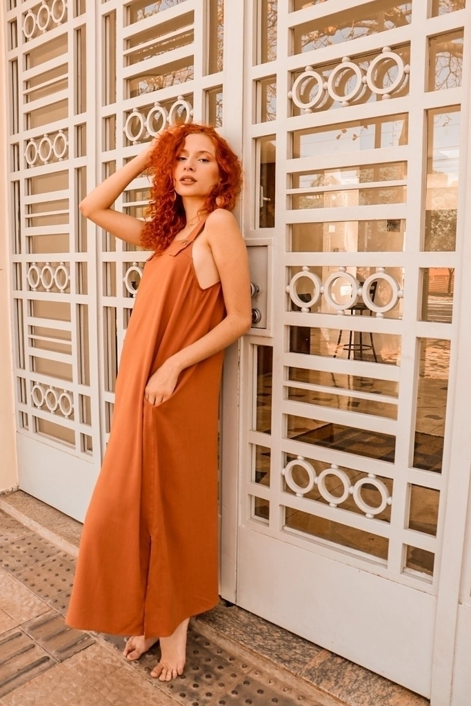 Cada vestido é cortado e costurado manualmente por mulheres artesãs do cerrado goiano, que dominam cada etapa do processo de produção — do molde à finalização. Esse cuidado garante acabamento preciso e um padrão de qualidade que respeita o tempo da costura feita à mão. Ao adquirir essa peça, você leva para casa não apenas uma roupa, mas um trabalho ético, consciente e conectado com o fazer manual.